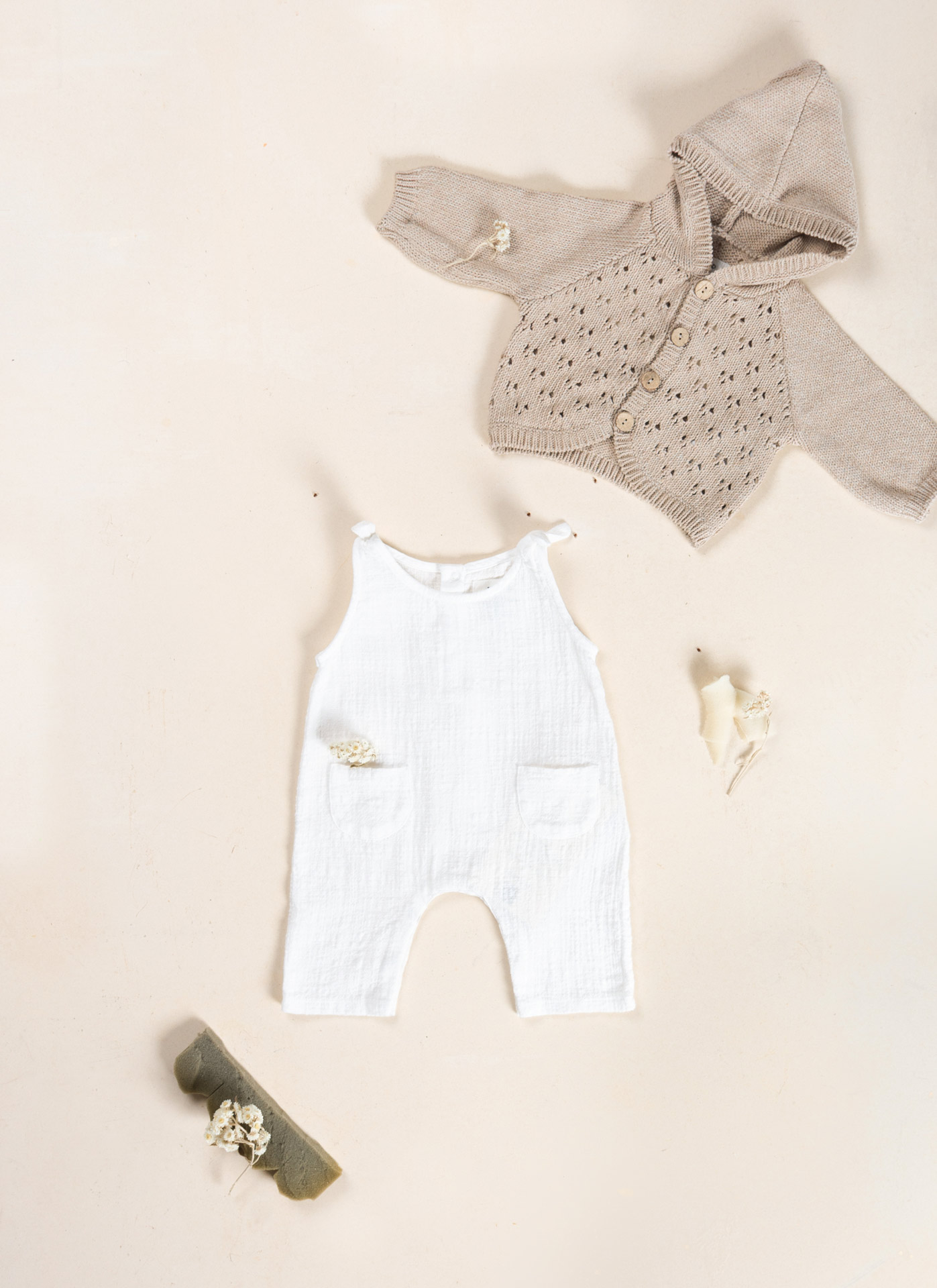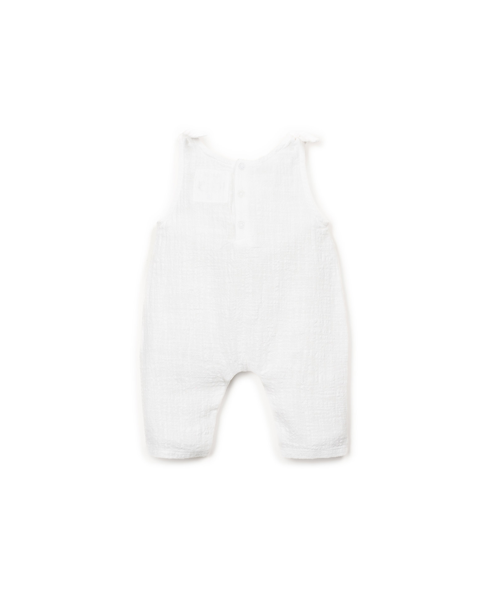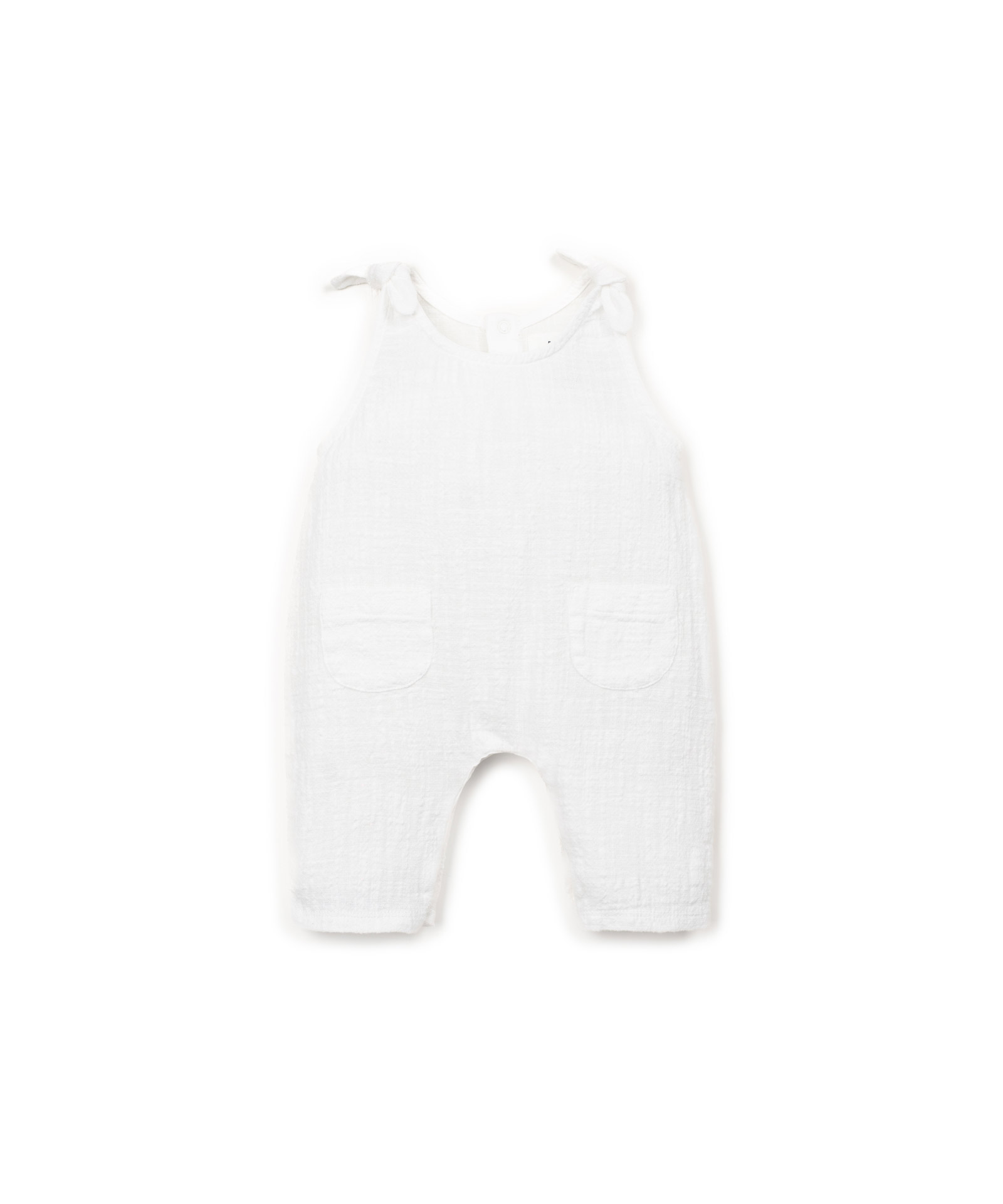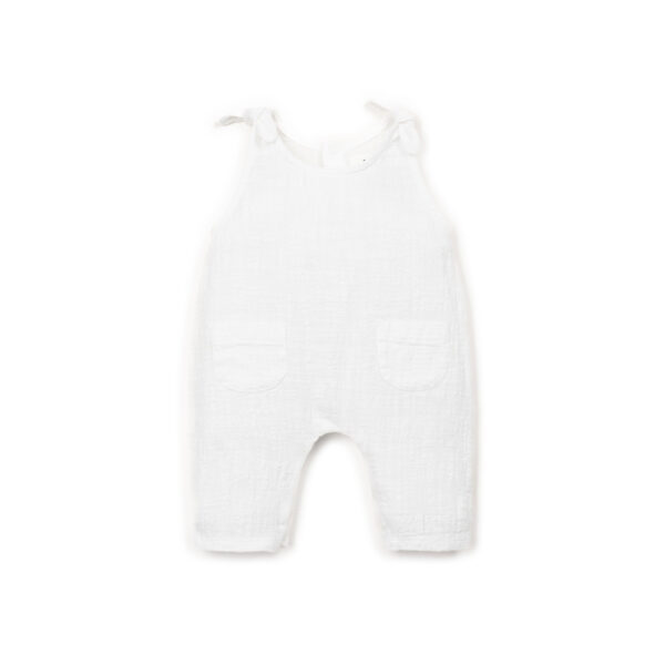 Cette combinaison est faite en tissu de coton biologique, de couleur blanche. Modèle sans manches, avec noeuds décoratifs sur les épaules, deux poches à l’avant et une ouverture au dos et à l’entrejambe avec des boutons-pression en métal sans nickel.