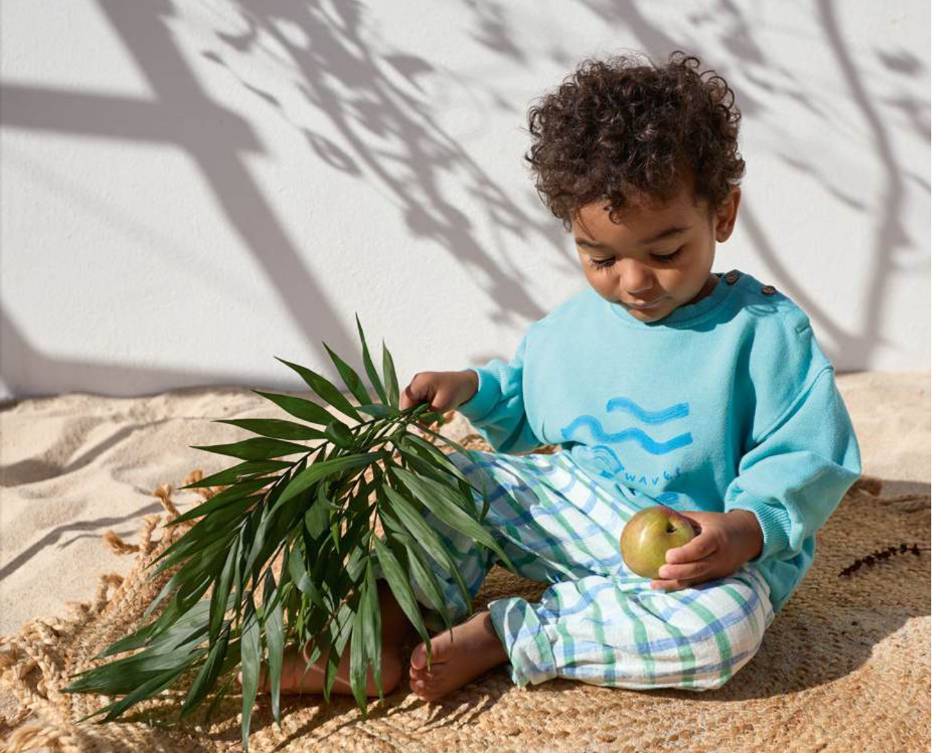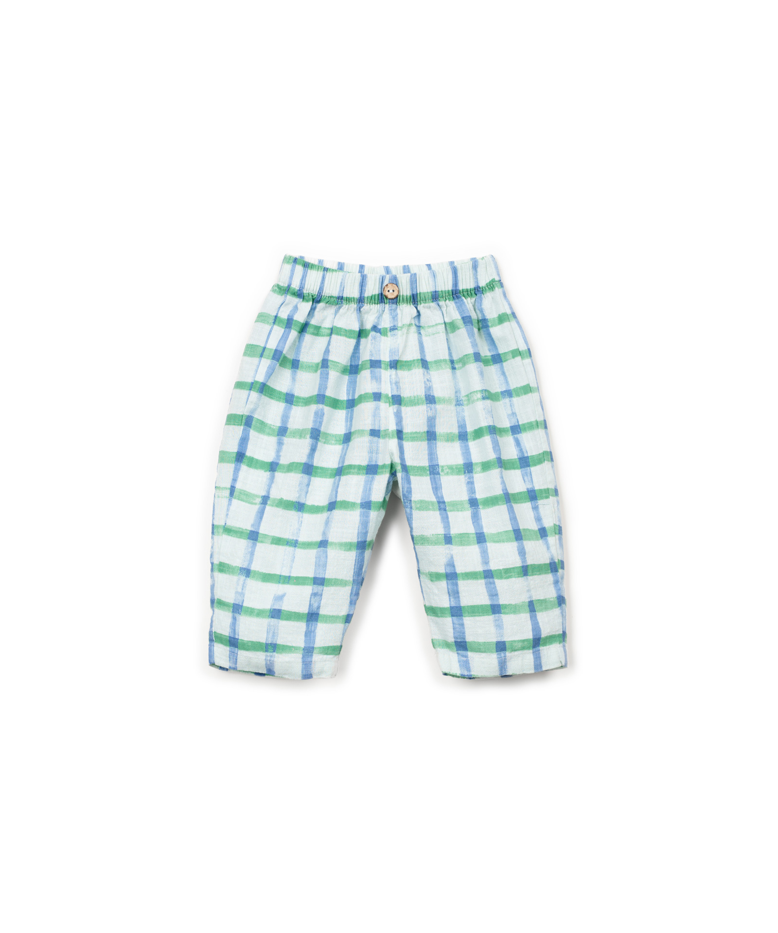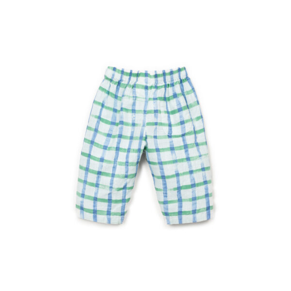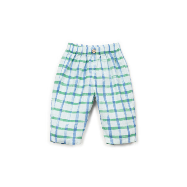 Ce pantalon est confectionné en tissu de coton biologique, de couleur bleu clair. Il dispose d’une ceinture élastique, d’un bouton en coco décoratif et de notre imprimé à carreaux. Ce vêtement a été conçu pour accompagner la transformation et la croissance, permettant d’être porté plus longtemps par le même enfant. Coupez la jambe le long de la marque horizontale légèrement plus foncée pour en faire un short.